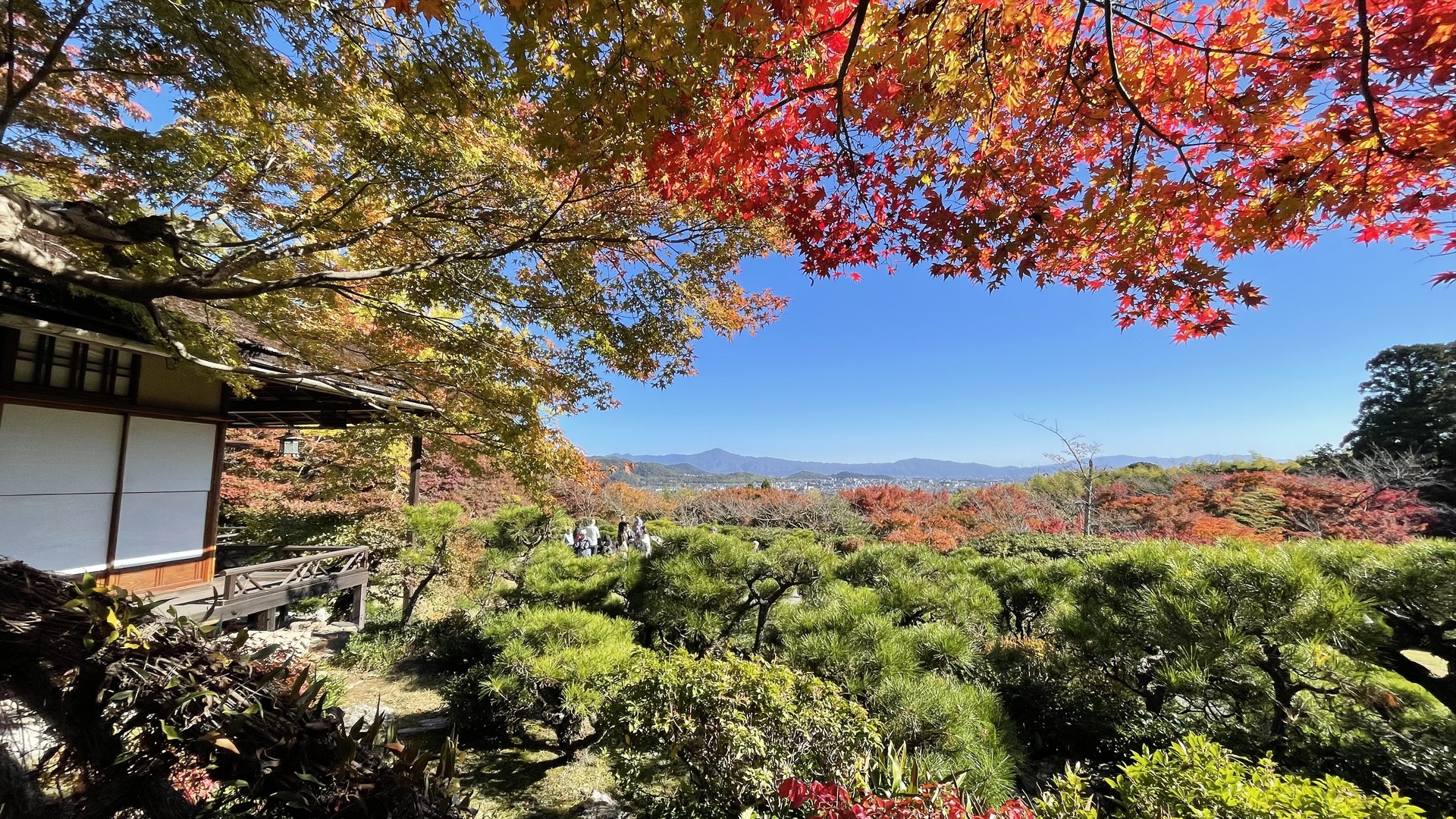 Ōkōchi Sansō 大河内山荘 is a villa in spacious surroundings above the Arashiyama bamboo grove. It once belonged to the Japanese silent-movie star Denjirō Ōkōchi, who designed the property in a very traditional Zen style with a large dose of perfectionism—tea pavilions, stone lanterns, red momiji leaves covering moss surfaces below maple trees, etc. The property is presently open to the public. The surroundings are partly natural, partly garden, a sensory delight for momijigari lovers, with far-reaching views over Kyōto towards Mount Hiei and the Arashiyama River gorge.
