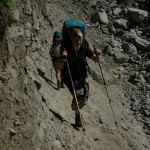 Descend from Larkya La :: descending along a morraine, an iron pole with katas