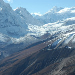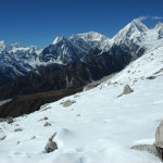 Descend from Larkya La :: Kang Guru Himal behind the Tibikle Panlemu ridges :: the green is Ponkar Tal