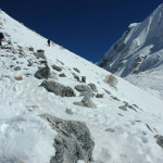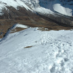 Descend from Larkya La :: the slippery descent traversing steep snowed scree slopes